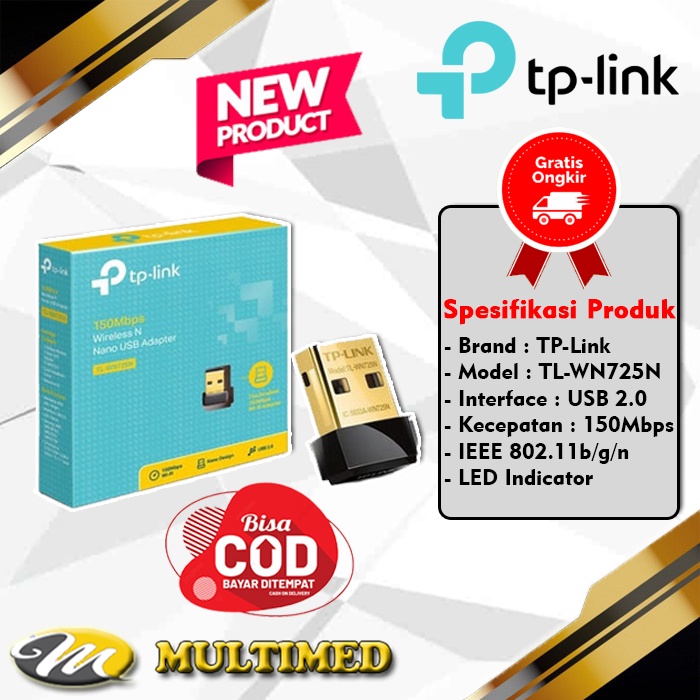 TP-LINK 150Mbps Wireless N Nano USB Adapter TL-WN725N -Desain miniatur Sleek begitu kecil dan setelah terpasang, dapat ditinggalkan dalam Laptop port USB. -Kecepatan nirkabel transmisi sampai dengan 150Mbps ideal untuk video streaming atau panggilan internet. -Advanced Security: Mendukung 64/128 WEP, WPA, PA2/WPA-PSK/WPA2-PSK (TKIP / AES)/ -Fasilitas utilitas setup yang mudah dan terdapat pada 14 bahasa. -Windows 10/8.1/8/7/XP, Mac OS X, Linux.