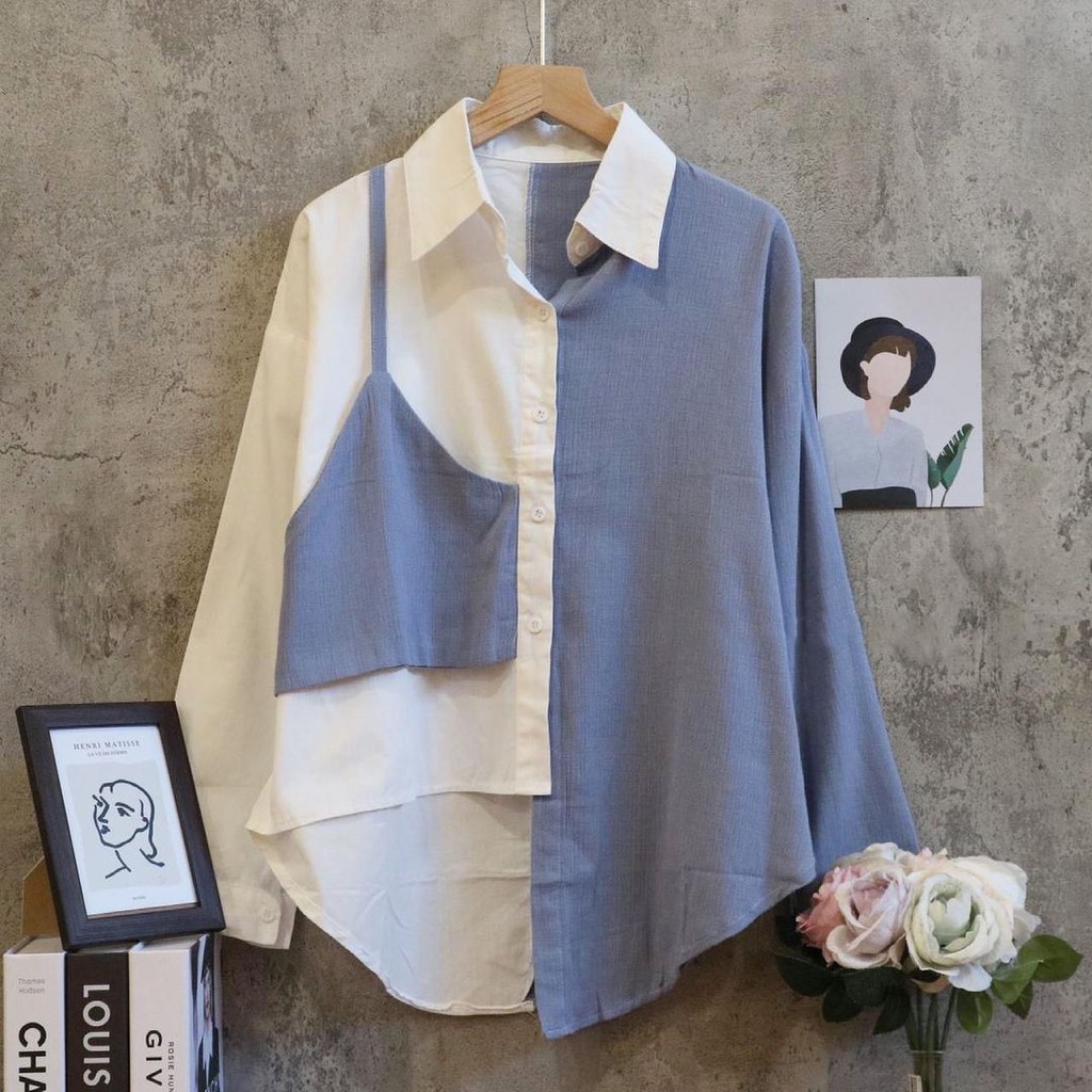 Pakaian Wanita > Atasan > Kemeja & Blouse > Tq88indonesia Fashion Blus Wanita Kombinasi Lengan Panjang Terbaru / Lucky Blouse / Ootd / Baju Santai Cewek