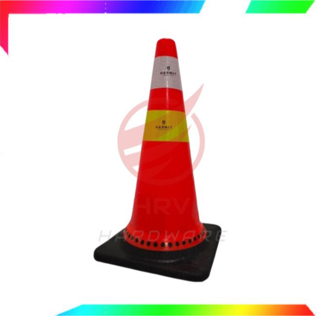 Traffic Cone 70 CM merk HARMIT berbahan PVC Elastis/ Lentur berwarna orange terang. Body Tebal dan kokoh. dengan base dasar berwarna HITAM dengan list berwarna kuning dan putih .