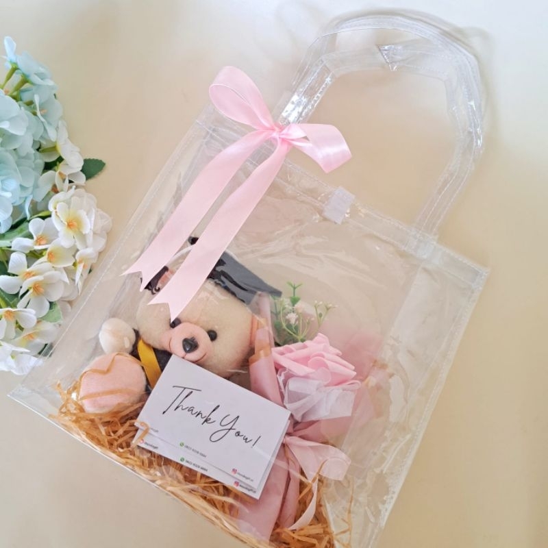 Makanan & Minuman > Set Hadiah & Hampers > TRANSPARANT BAG WITH BOUQUET EDELWEIS / BONEKA / TEDDY BEAR TOGA/WISUDA GIFT /KADO/HADIAH WISUDA/GRADUATION/BIRTHDAY/ANNIVERSARY/WEDDING