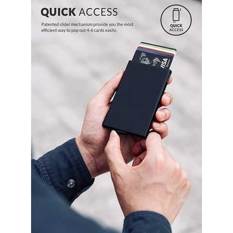 Dompet kartu ini memiliki konsep yang unik dimana kartu-kartu disimpan pada satu slot yang sama dan untuk mengeluarkannya cukup menekan tombol yang ada pada bagian bawah dompet dan kartu-kartu akan keluar secara otomatis. Sangat praktis dan keren saat digunakan, mirip seperti dompet dari masa depan. Fitur Anti RFID Dompet kartu ini memiliki fitur blocking RFID untuk mencegah terjadinya maling digital dengan cara mengetap RFID ke dompet Anda.