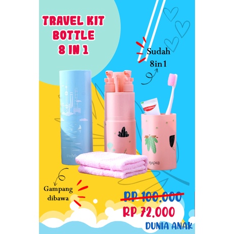 Deskripsi Produk : Travel Kit 8in1 SKU : RS-010 Bahan : Plastik, Kain Berat : 300gr Varian : pink, biru, abu Isi : Handuk 1, Botol Sabun 2, Sikat Gigi 1, Pasta Gigi 1, Cermin 1, Gelas 1, Sisir 1