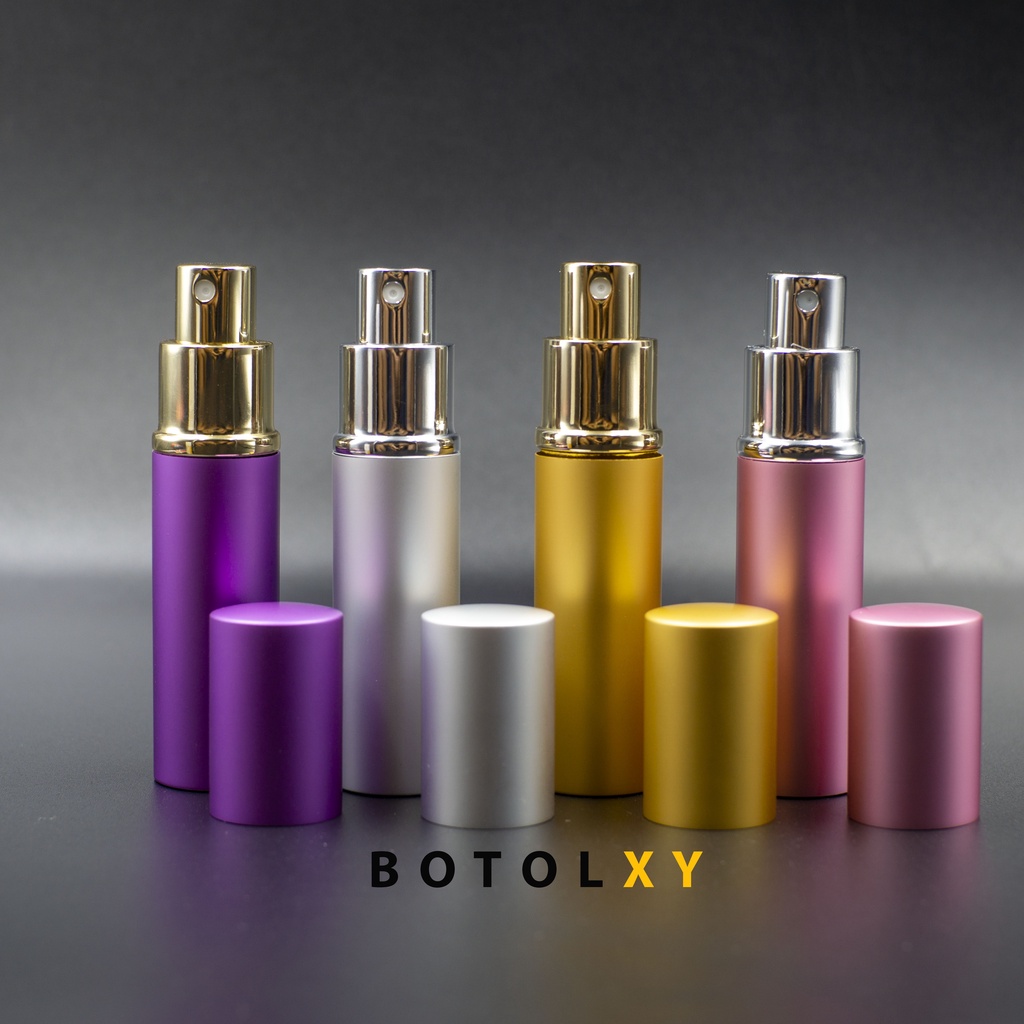 - Warna Botol : Silver, Biru, Cokelat, Emas, Pink, Ungu, Merah dan Hitam - Botol : Kaca Bening / Transparan - Casing luar Aluminium - Kapasitas : 10 ml - Tinggi : 10 cm - Diameter : 2,3 cm