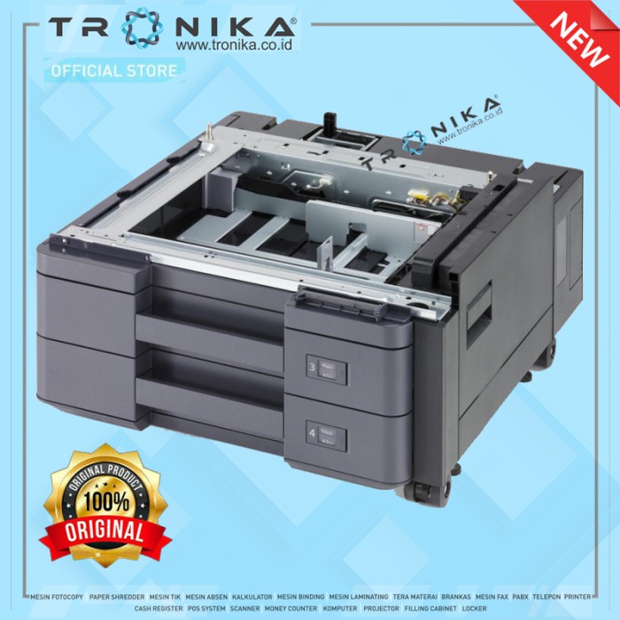 Tambahkan 2 lembar tambahan 500 lembar setiap kaset kertas untuk meningkatkan kapasitas kertas secara keseluruhan hingga 2.000 lembar. Setiap baki mampu menahan kertas hingga A3 dalam ukuran dan hingga 300gsm berat. Hanya cocok untuk model taskALFA 2552ci dan 325ci. Gambar yang ditampilkan hanyalah untuk representasi saja dan dapat dikenai sedikit variasi.