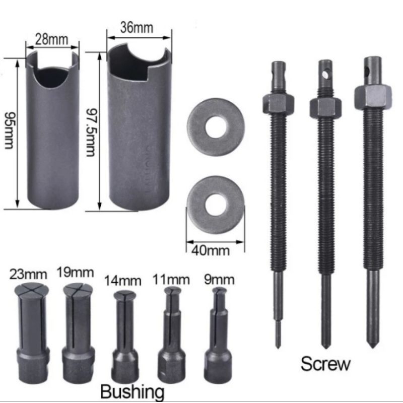 1. 5 buah mata bearing yaitu ; 9mm, 11mm, 14mm, 19mm, dan 23mm 2. 3 buah batang puller - Batang 5 mm - batang 7 mm - batang 9 mm 3. 2 buah Pipa Penampang - Pipa Lingkar 28 mm - Pipa Lingkar 36 mm 4. 2 Ring 40 mm