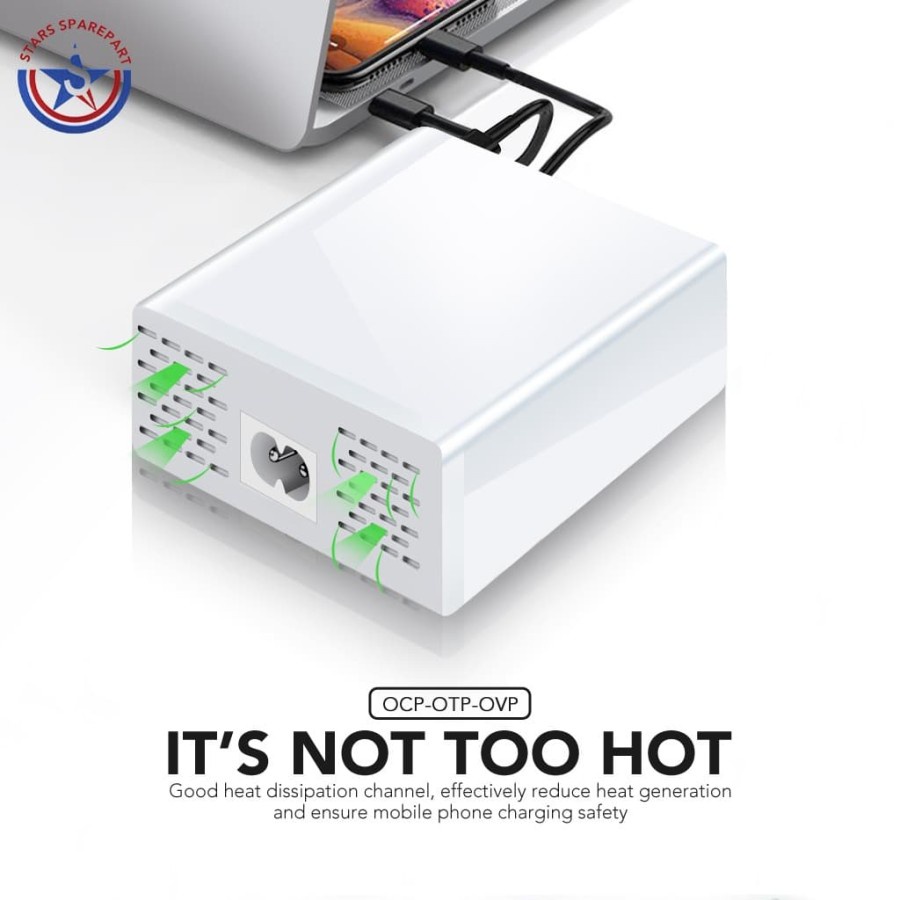 896 40W - Model :896 - Warna : Putih - Input : AC 100-240V 50-60Hz .025A - LED function: Ada - Total Power :40W (Support QC3.0 fast charger ) - Output(Merah) : 5V 8A MAX, (2.4/Port) - Output(Hijau /QC3.0) :DC 5V 3.4A / 9V 2A / 12V 1.5A