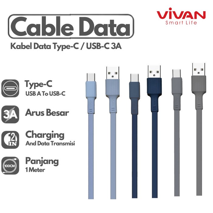Spesifikasi: Brand : Vivan Item Code : CTC100S Output 2.4-3A Max Length : 1 Meter Material : Eco-Friendly TPE Color : Light Blue , Grey , Navy Blue