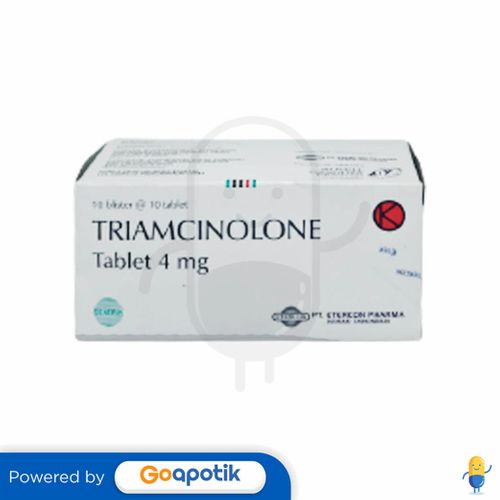 Deskripsi : PENGGUNAAN OBAT INI HARUS SESUAI PETUNJUK DOKTER. Obat ini digunakan untuk pengobatan pada kondisi seperti gangguan endokrin, gangguan rematik, penyakit kolagen, penyakit dermatologi, dan keadaan alergi, penyakit mata, penyakit pernapasan, gangguan hematologi, penyakit neoplastik, keadaan edema, penyakit gastrointestinal, dan lain-lain. | Komposisi : Tiap tablet mengandung triamcinolone 4 mg | Dosis : ATURAN PAKAI HARUS SESUAI DENGAN PETUNJUK DOKTER. Dosis awal bervariasi dari 4-48 mg tiap hari tergantung dari penyakit spesifik tertentu yang sedang diobati. Untuk bayi dan anak-anak: Dosis yang direkomendasikan harus diatur dengan pertimbangan yang sama seperti di atas daripada dengan aturan yang ketat terhadap rasio usia atau berat badan. | Indikasi : Digunakan untuk pengobatan pada kondisi seperti gangguan endokrin, gangguan rematik, penyakit kolagen, penyakit dermatologi, dan keadaan alergi, penyakit mata, penyakit pernapasan, gangguan hematologi, penyakit neoplastik, keadaan edema, penyakit gastrointestinal, dan lain-lain. | Perhatian Khusus : Hati-hati penggunaan pada pasien hipertensi, herpes simpleks okular, sirosis, hipotiroidisme, kolitis ulseratif non spesifik, diabetes melitus | Kemasan : Box, 10 blister @ 10 tablet | NIE : GKL1015710210A1