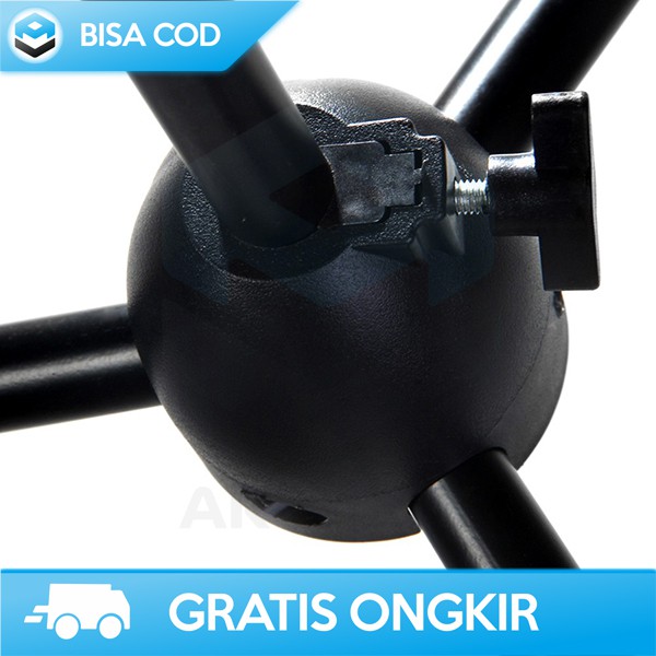 Tripod Stand mikrofon ini memiliki 3 buah kaki yang sama panjang dan dapat di atur sehingga stand selalu seimbang dan tidak membuat mikrofon yang di pasangkan terjatuh. Disertai dengan knop yang berfungsi untuk mengunci posisi kaki tripod.