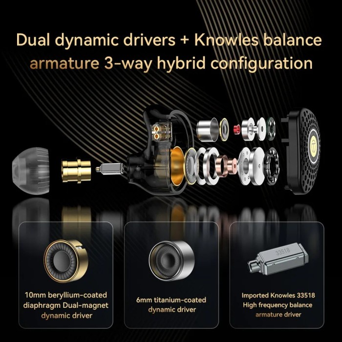 Dual dynamic drivers + Knowles balance armature 3-way hybrid configuration TRN TA3 comes equipped with 10mm beryllium-coated dual-magnetic dynamic driver responsible for low frequency. A 6mm titanium-coated dynamic driver for mid range and upper-mid range frequency. Knowles 33518 balance armature for treble. Complimented by an advanced, custom-tuned frequency crossover network, TA3 is able achieve deep punchy bass, clear vocals and exceptional resolution without harshness