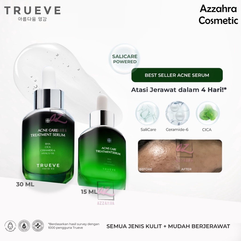 Urutan Pemakaian: ✔️Bilas wajah menggunakan Trueve Low pH Facial Cleanser ✔️Keringkan, lalu aplikasikan Trueve MC2 Essence Toner. Tunggu beberapa saat ✔️Teteskan 2-3 tetes Trueve Acne Care Treatment Serum kemudian usapkan dan pijat perlahan pada permukaan kulit wajah ✔️Gunakan 2x sehari secara rutin untuk mendapatkan hasil yang maksimal, ✔️Hasil dapat dilihat dalam waktu 3-4 minggu