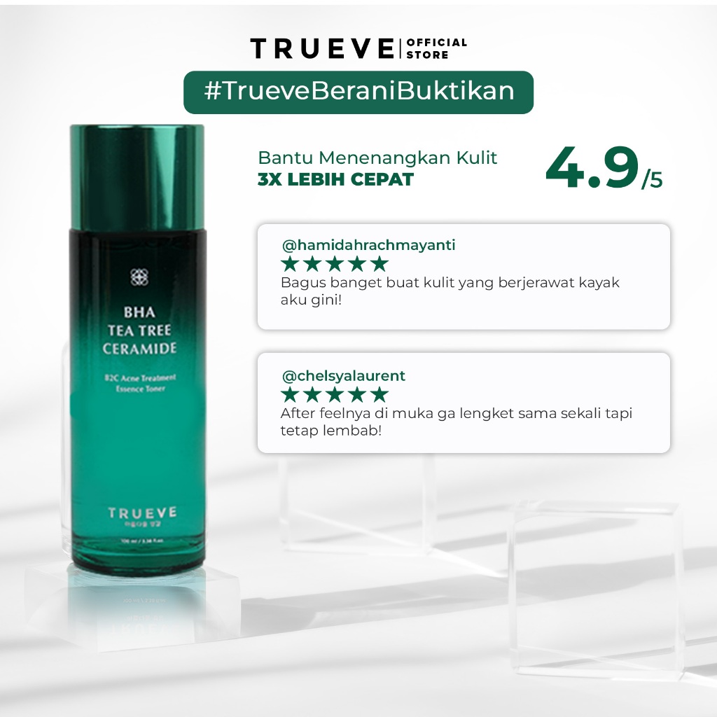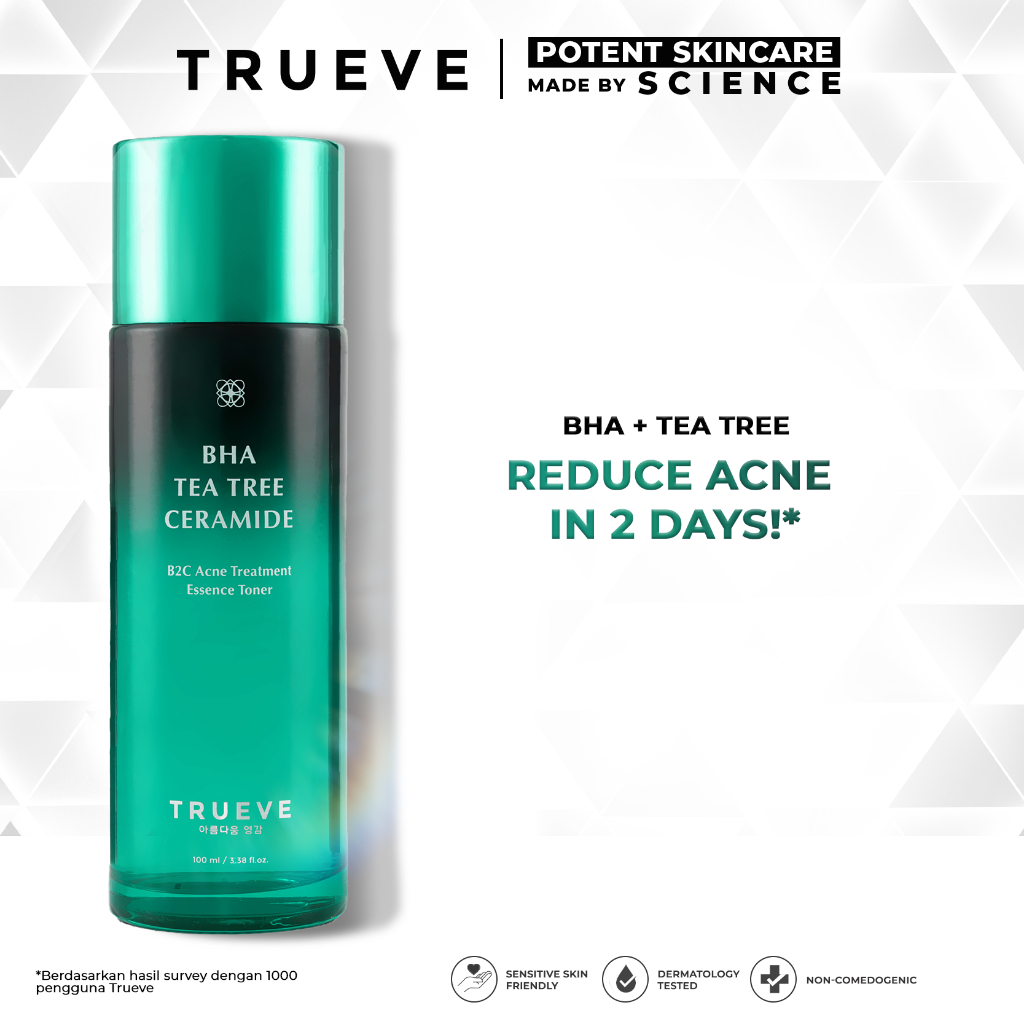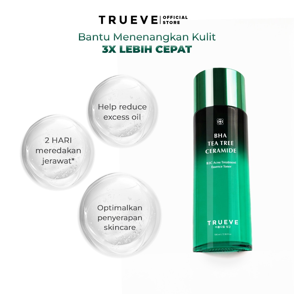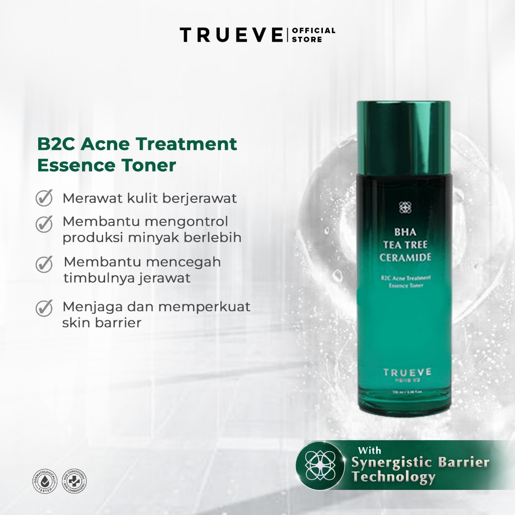 Trueve B2C Acne Treatment Essence Toner diformulasikan khusus untuk kulit sensitif dan berjerawat, memiliki Tea Tree dan BHA sebagai kandungan utama, Trueve B2C Acne Treatment Essence Toner berfokus untuk merawat kulit berjerawat dan menghambat pertumbuhan bakteri penyebab jerawat.