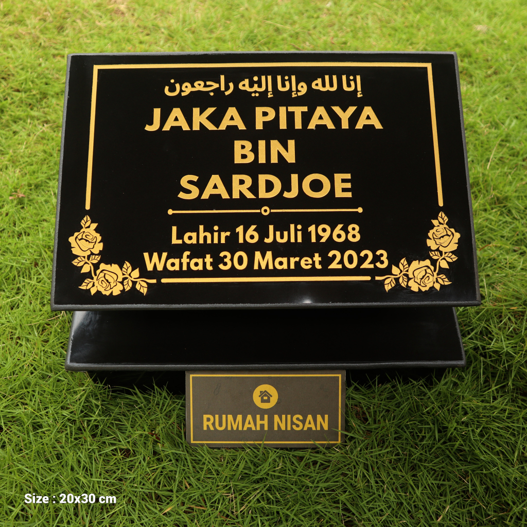 Batu Nisan Dengan Kualitas Terbaik, Tahan Lama, Awet dan Tidak Mudah Luntur Detail Produk : 1. Batu Nisan Set dengan TUGU/DUDUKAN 2. Ukuran 20x30cm 3. Bahan yang kami pakai khusus menggunakan granit tile. 4. Cat yang kami gunakan menggunakan cat khusus sehingga tidak mudah luntur terkena panas matahari & Hujan. 5. Granit tile glossy/mengkilat.