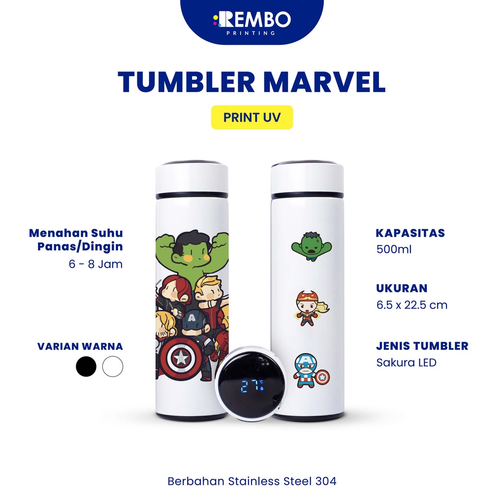 Detail Tumbler Edisi Marvel Avengers Smart LED Cetak UV/Hadiah Wisuda/Kado Wisuda/Hadiah Ulang Tahun/Souvenir Tumbler/Termometer/Promosi Murah