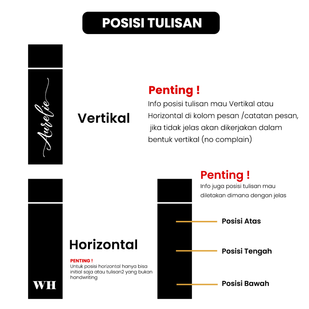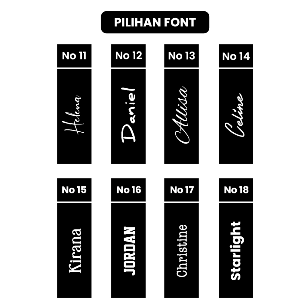 ✅CARA ORDER Tumbler Custom 1. Pilih warna Tumbler Japan (Hitam / Putih) 2. Jika custom tulisan / nama, pilih varian Font no berapa yang kalian suka (cek model font geser foto kesamping) 3. Jika mau custom logo / desain sendiri pilih varian "Custom Desain" 4. Tulisan / nama yang mau di custom + posisi tulisan Vertikal / Horizontal ditulis di kolom pesan / catatan saat Checkout 5. Ada info tambahan tolong sertakan di kolom pesan / catatan juga 6. Untuk file custom desain / logo email ke => bagianproduksi.sketch@gmail.com (khusus yang custom sendiri), Subjek email dikasih NO PESANAN / INVOICE