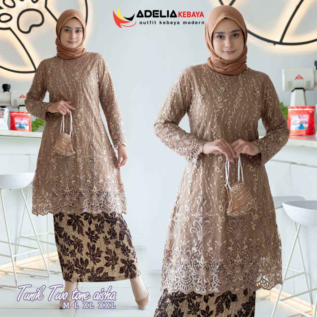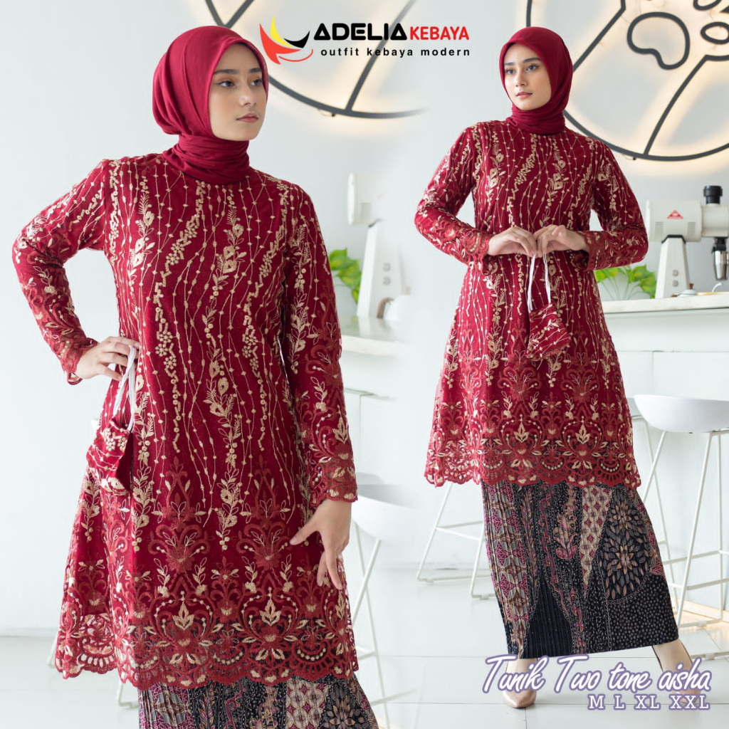 SET KEBAYA TUNIK AISYAH MATERIAL = ⢠BAHAN KEBAYA : tulle twotone ( ada furing nya ) ⢠SIZE : LD (lingkar dada) M : 96 L : 102 XL. : 108 XXL : 116