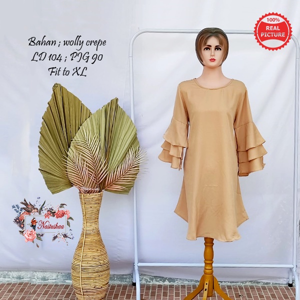 Tunik Wanita Modern Model Lengan Lonceng Tumpuk 7/8 Bahan Wolly Crepe Mocca Baju Atasan Wanita Muslim Terbaru Long Tunik Kekinian