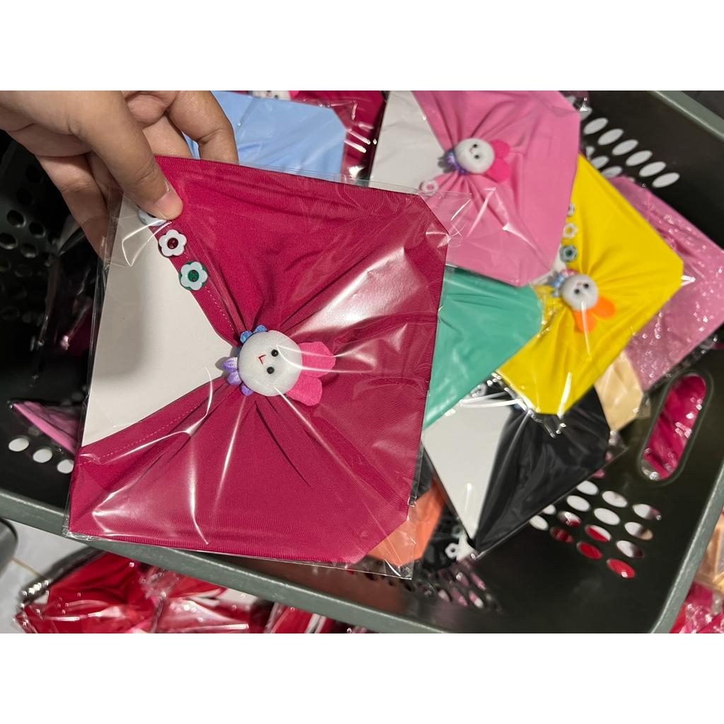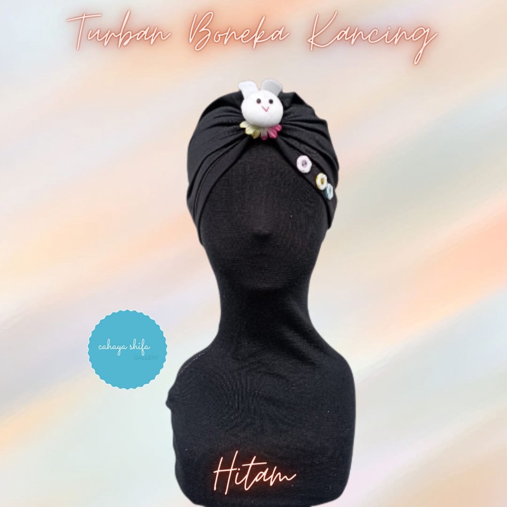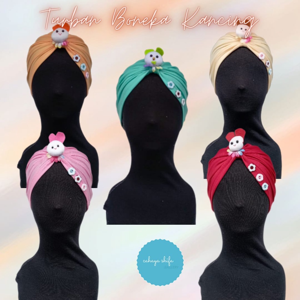 Turban anak dengan hiasan boneka dan kancing packing plastik perpcs aman dipakai anak usia 0- 3 tahun, bahan jersey melar jadi tidak akan sempit untuk kepala si bayii.. ready warna merah kuning toska hitam pink krem peach lilac fanta