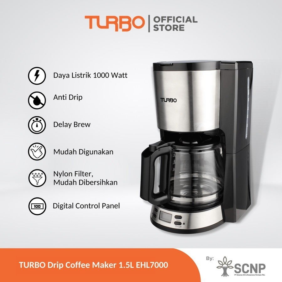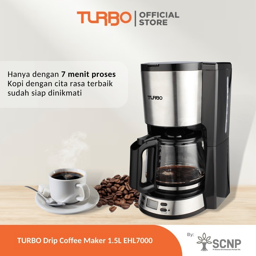TURBO Drip Coffee Maker EHL7000 mempunyai kapasitas 1,5 L yang sangat mudah digunakan dan dibersihkan, dilengkapi dengan anti drip feature dan Fitur Delay Brew untuk hasilkan rasa kopi terbaik sehingga membuat aroma kopi lebih kuat, hanya dengan 7 menit proses, anda sudah bisa menikmati kopi dengan cita rasa terbaik.