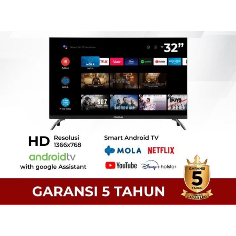 Spesifikasi : LED TV 32'' HD Smart TV , DVB-T2, ATV OS Android 11 RAM 1GB, Room 8GB Siund Wave / Bluetootk (transmitter) Bluetooth version 5.0 Wifi dual band 2.4/g GHz Ethernet RJ45 Port 2 HDMI Input 2 USB Input ( Movie, MP3, Jpeg.) AV Input Digital Audio Output / SPDIF (optical) Input AC : 180-240~50/60Hz 50 Watt Dimensi Produk (w/base stand) : 75.5(W) x 21,1(D) x 49,3(H) cm Dimensi Kemasan 80,7(W) x 12,1 (D) x 51,0 (H) cm Volume kemasan : 49.800 cm3 Approx Berat kemasan 5.600 gr Approx Key Features : Android TV OS with MOLA TV Apps Exclusive, YouTube,Netflix, Play Store Chromecast Built - in & Bluetootk Remote with Google Assistant 5 Years Warranty ( includeing LED panel )
