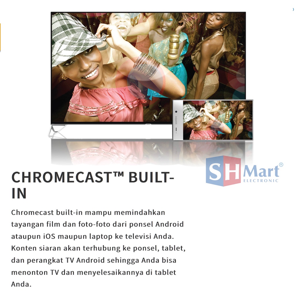(*) HD Resolution (*) Sharp's Android TV with Google Assistant (*) X2 Master Engine (*) Azan Reminder (*) Chromecast (*) Bluetooth Audio Out (*) Smart Device Control