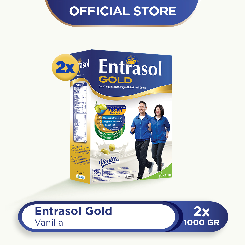 Entrasol Gold merupakan Nutrisi Tinggi Kalsium dengan Ekstrak Buah Zaitun yang dilengkapi dengan Pro-Fit Advance Formula: tinggi serat, omega 3 &6, 11 Vitamin & 8 Mineral, Tanpa Penambahan Gula serta Lebih Rendah Laktosa sehingga nyaman di perut. Entrasol Gold bantu jaga kekuatan tulang dan kesehatan jantung.