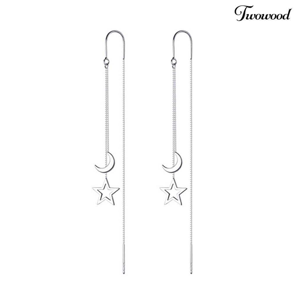 Twowood 1pasang Anting Menjuntai Warna Perak Jumbai Super Panjang Mungil Bintang Bulan Liontin Wanita Linear Earrings Fashion Jewelry