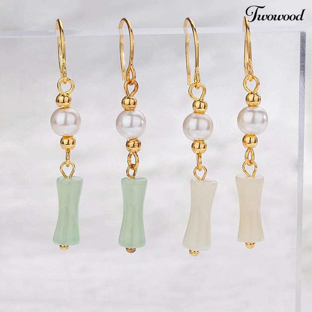 Detail Twowood 1pasang Anting Menjuntai Manik-Manik Mutiara Imitasi Gaya Cina Faux Hetian Jade Bamboo Joint Hook Earrings Aksesoris Perhiasan