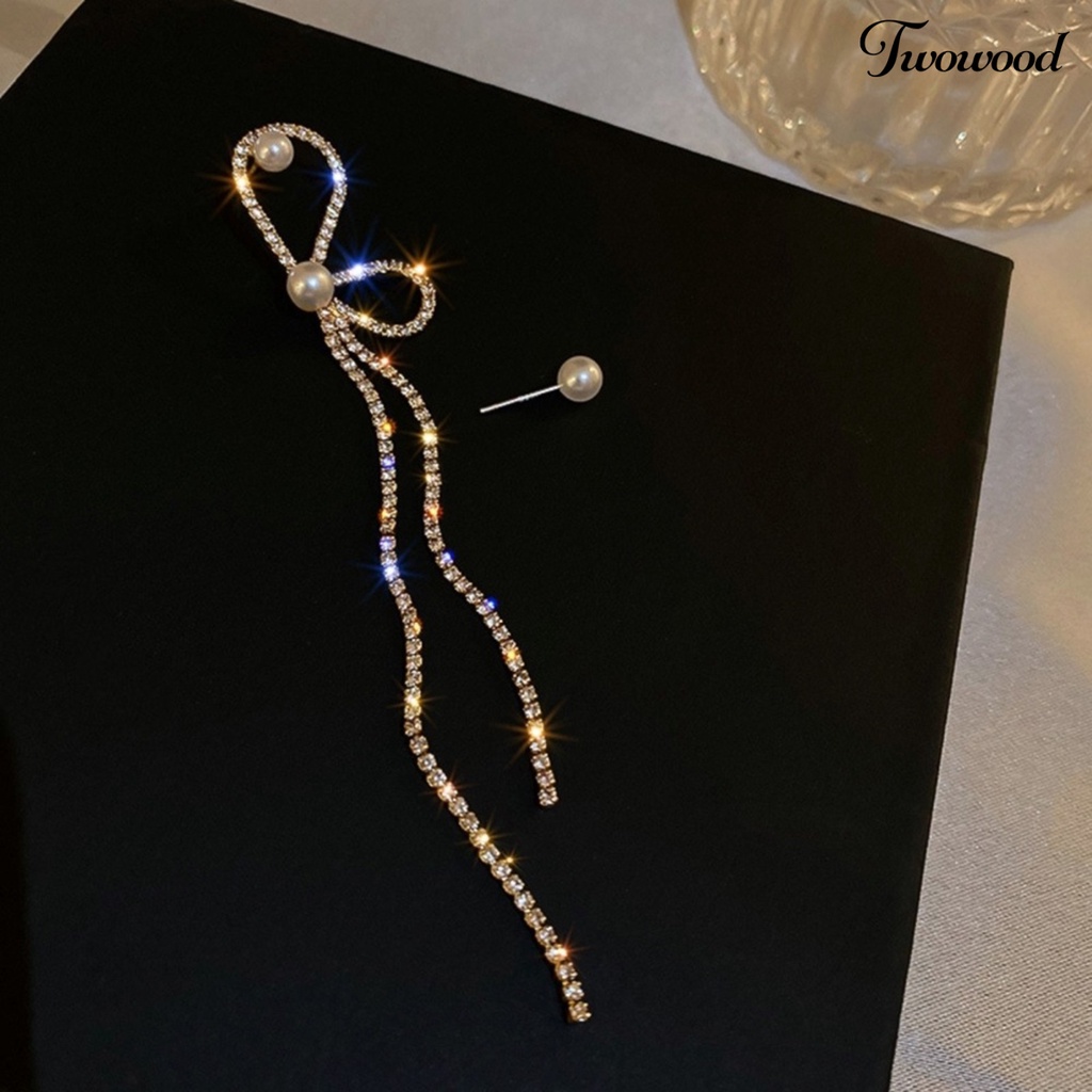 Twowood 1pasang Anting Rumbai Asimetri Busur Mutiara Imitasi Berlian Imitasi Bersinar Dekorasi Tahan Luntur Panjang Rumbai Menjuntai Anting Gantung Aksesoris Perhiasan