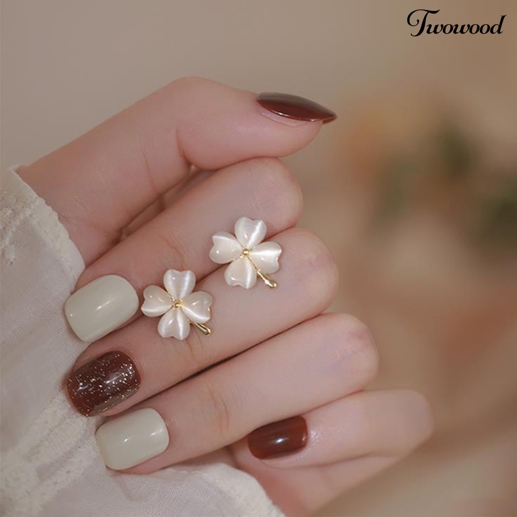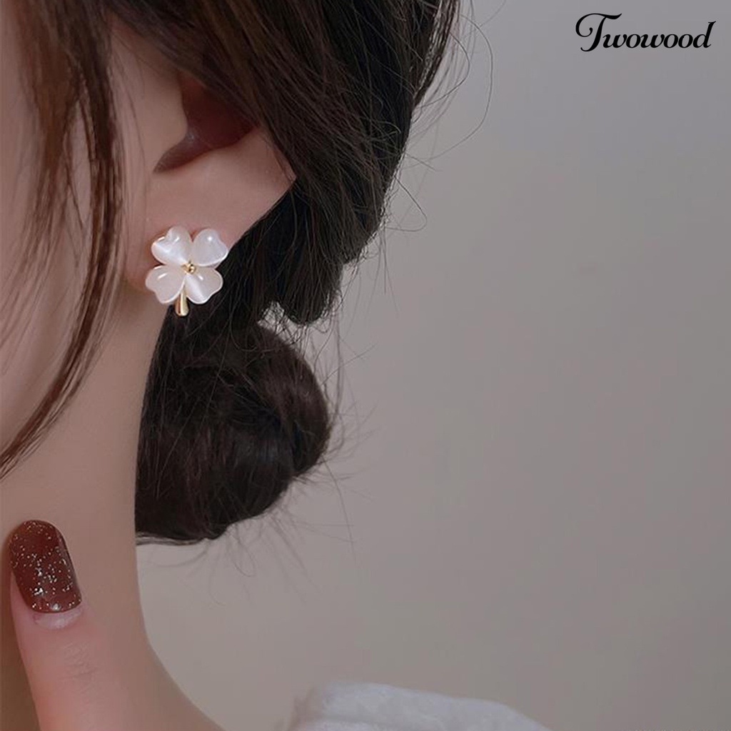 Detail Twowood 1pasang Ear Studs Faux Opal Makna Keberuntungan Desain Sederhana Temperamen Empat Daun Semanggi Stud Earrings Aksesoris Fashion