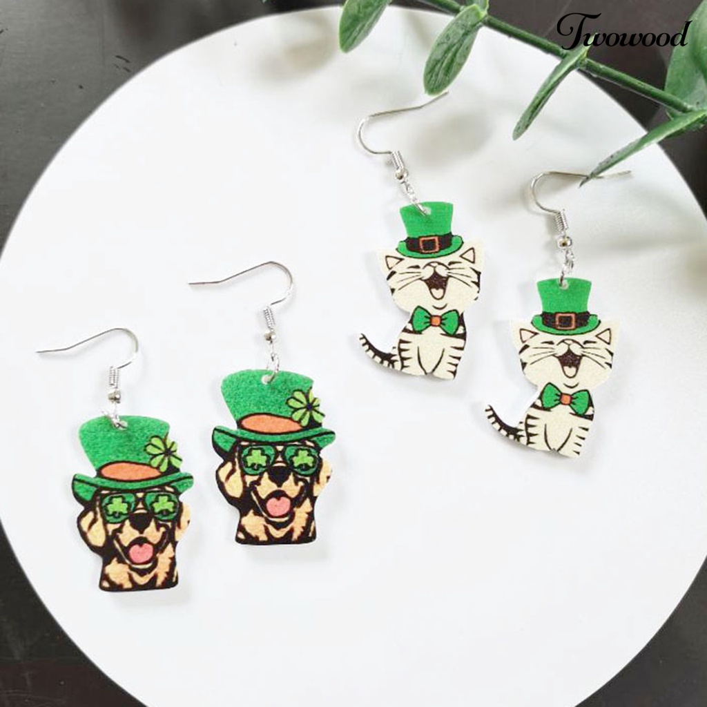 Twowood 1pasang Kait Anting Kayu Dua Sisi Shamrock Clover Lucu Irish Hijau Topi Anjing Menjuntai Anting Perlengkapan Hari Saint Patrick