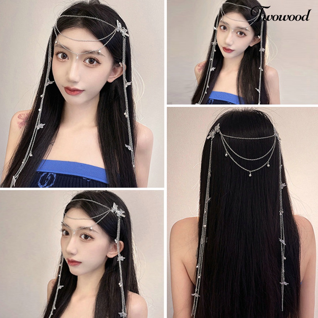 Detail Twowood Head Chain Folk-custom Alloy Bunga Kupu-Kupu Rumbai Frontlet Hiasan Kepala Dengan Lonceng Mini Pakaian Sehari-Hari