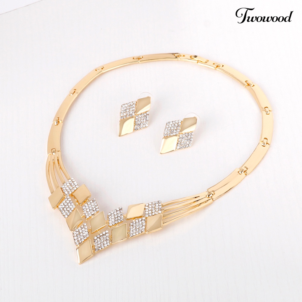 Detail Twowood Wanita KC Lapis Emas Bentuk Belah Ketupat Kalung Anting Rhinestones Set Perhiasan