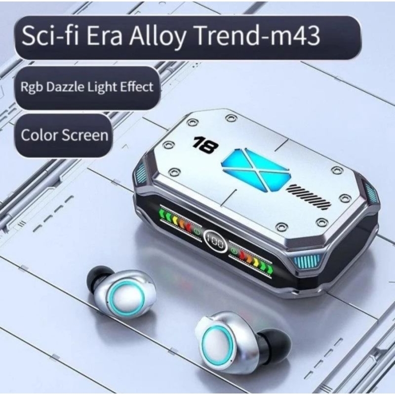 TWS M43. Headset bluetooth yg keren abis! Berbahan metal warna silver sehingga tampil scientifically futuristik. Dilengkapi dengan noise cancelling technology. Bluetooth V5.3 yang lebih stabil. Hi fi sound. Microphone yang menunjang HD call. Digital indicator. LCD indicator warna. Suara yang dihasilkan jernih dan besar dengan technology noise reduction dan HD sound. Cocok untuk main game dengan suara yang besar dan tidak delay. Cocok juga untuk telepon, nonton youtube, diskusi zoom, dll.