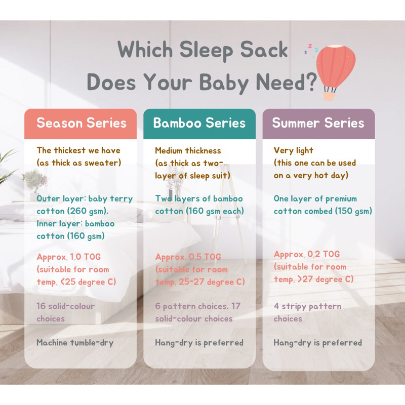 This series is lighter than Season Series (1.0 TOG). If you are looking for sleep sack to wear in a 20-22 degree celsius room temperature without having to add long-sleeve pajamas underneath, you can try Season Series (it is thicker).