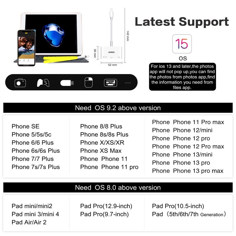 Adaptor kamera USB 5 in 1 ini kompatibel dengan lebih banyak perangkat USB, seperti Hubs, flash drive USB, Kamera, keyboard, keyboard midi, dll. Ini Mendukung perangkat iOS 9.2-iOS 15 ke atas, lebih banyak fungsi OTG hanya didukung Sistem iOS 13 dan iOS. Sistem 15.