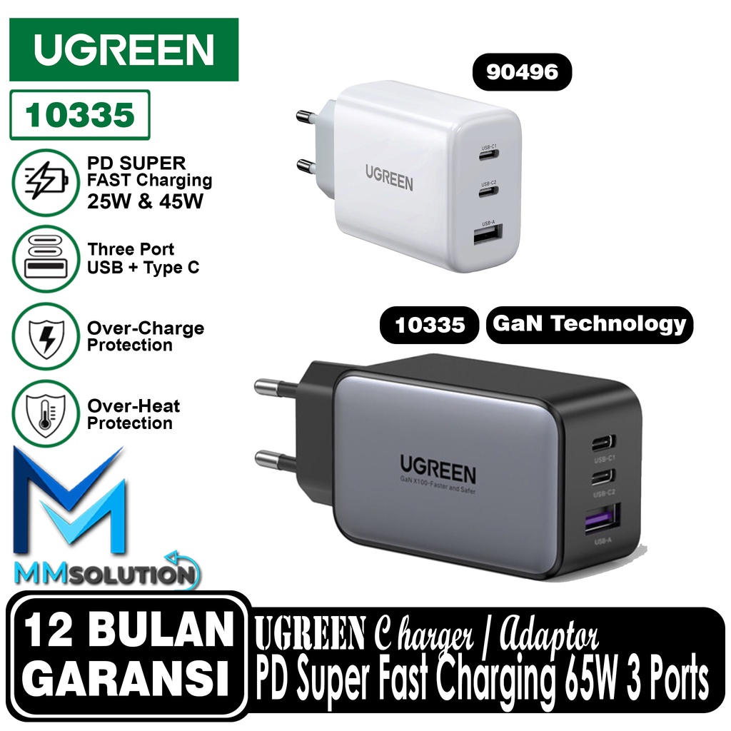 B. 10335 (GaN Nexode Series) Specification: - Brand: Ugreen - SKU: 10335 - Total Output 65W - USB C1 / C2 = 65W Max - USB A = 22.5W - C1 + C2 = 45W + 20W - C1 + A = 45W + 18W - C2 + A = 8.5W + 8.5W - C1 + C2 + A = 45W + 8.5W + 8.5W - Warna: Black