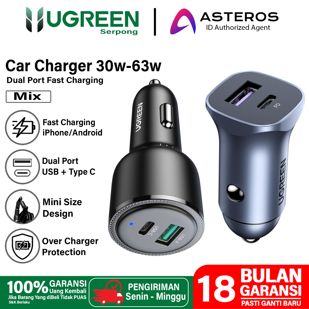 UGREEN Car Charger Dual Port USB A + USB C - Model : CD213 60980 (42.5W-60980) - Input: DC12-24V - USB-C Output: 20W Max - USB-A Output: 22.5W Max - Support PD3.0, QC 3.0, SCP - Total Output: 42.5W