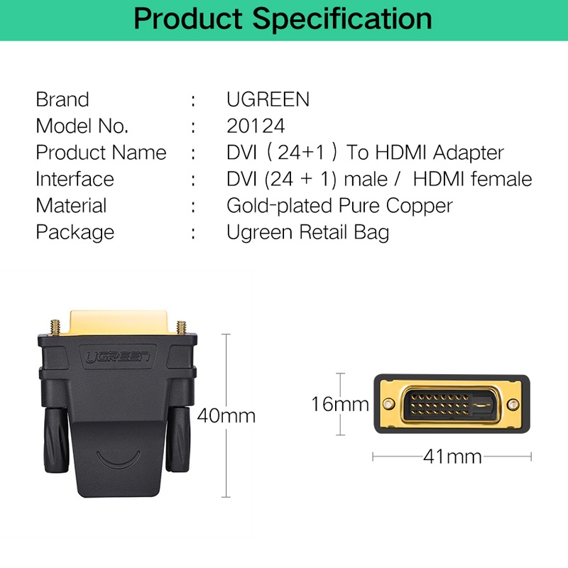- Adaptor UGREEN High Speed HDMI Female to DVI-D 24+1 Pria memungkinkan Anda menghubungkan perangkat sumber yang dilengkapi HDMI seperti Laptop/ Desktop, Blu-Ray, Xbox 360, PS3, Apple TV, DVD, dan Set Kotak Atas ke HDTV, Tampilan, atau Proyektor berkemampuan DVI Anda dengan kabel HDMI yang ada (tidak termasuk).