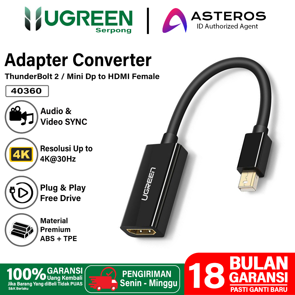 Deskirpsi: -Model : 40360 -Color : Black -Connector A : Mini Display Port -Connector B : HDMI Female -Material : Premium TPE + ABS -Length : 18Cm -Resolusi : Ultra HD 4K 30Hz