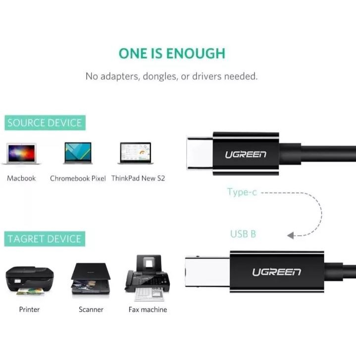 A Must Have USB-C to B Cable for Your Macbook UGREEN 2.0 USB-C to USB-B printer cable is designed to transfer data from Type-C equipped laptop or PC to Type B 2.0 printer or scanner like Brother, Canon, Dell, Epson, Fujitsu, HP, Panasonic, Lexmark, Samsung printers etc. Support stable and fast data transferring rate up to 480 Mbps.