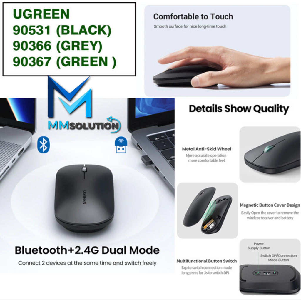 Deskripsi : - Merek : UGREEN - Model 90372 : Black - Model 90374 : Green - Model 90373 : Gray - Material : - Connection:Wireless 2.4GHz,Bluetooth 5.0/3.0 (dual Mode ) - Distance:15M - 4-Level DPI:1000/1600/2000/4000DPI - Battery:1*AA Battery(Not included) - LED Indicator:Blue/Green LED - DPI Switch:Press the DPI button to switch cyclically - Support System:Windows7/8.1/10/11, macOS 10.15, iOS13.4, iPad OS 14.0,Linux, Chrome OS,Android5.0,or Others