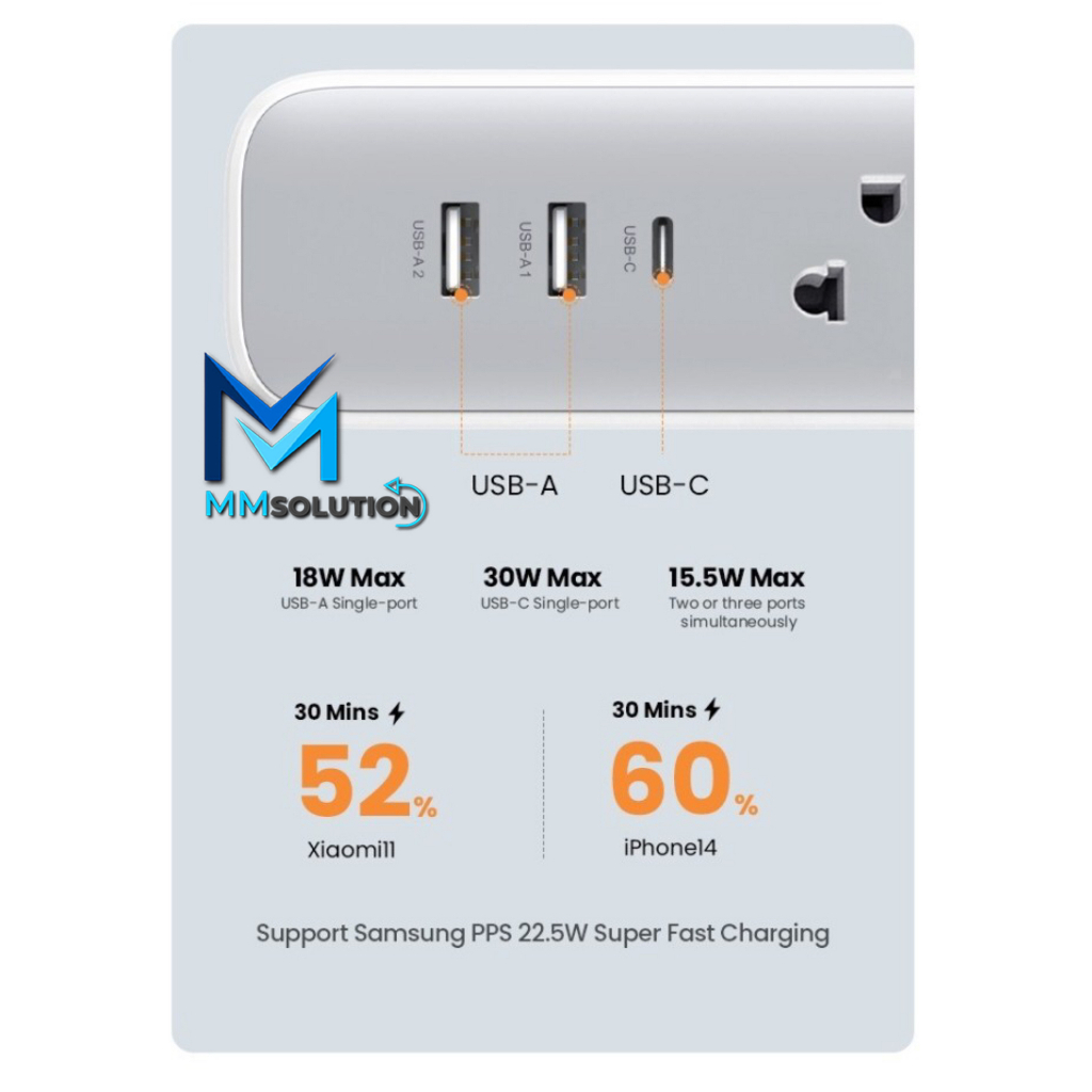 Spesifikasi - Power Socket strip Plug - UK Head 3 Pin - Terdapat 3 Colokan stop Kontak AC 220V - 1 Port USB Type C - 2 Port USB A - Total 6 Port - USB A OUT MAX 18W - USB C OUT MAX 20W (PD) POWER DELIVERY - AC 220V - Fast Charging MAX UP TO 30W - Bahan ABS Flame retardant (Anti panas) - Fitur Keamanan GDT - Dipengkapi GaN Chip Dan Protocol Chip Membuat Pengisian aman dan Stabil