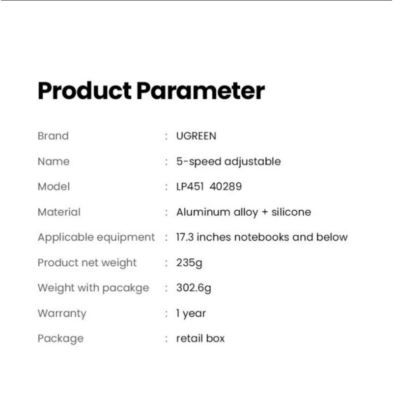 Spesifikasi Merk: UGREEN Nama: Dudukan notebook paduan aluminium 5 kecepatan yang dapat disesuaikan Model: LP451 40289 Bahan: paduan Aluminium + silikon Peralatan yang berlaku: Notebook 17,3 inci ke bawah Berat bersih produk: 235g Berat dengan pacakge: 302.6g Garansi: 1 tahun Paket: kotak ritel Ps: Pengukuran Manual, perkenankan sedikit kesalahan