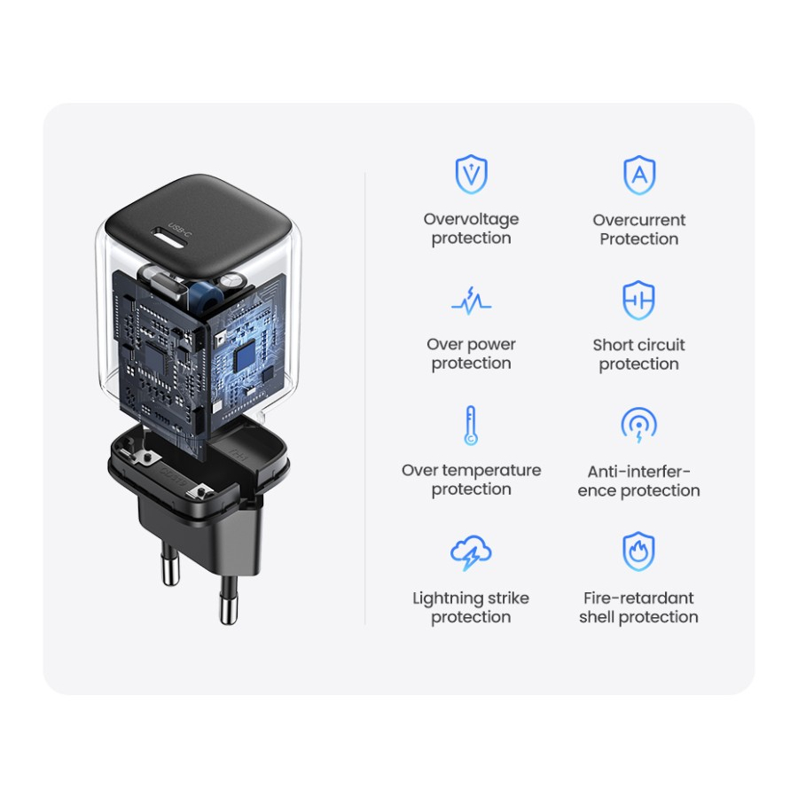 Deskripsi : - Merek : UGREEN - Model : 90666 30W - Nexode GaN Charger - Material : Flame-retardant - Interface : PD Type C - Color : GRAY - Function : Charging -Input : 100-240V, 50-60Hz, 800mA Max -USB-C output : 5V=3A, 9V=3A, 12V=2.5A, 15V=2A, 20V/1.5A, 3.3-11V=2.7A -Multiple Protection : Thermal Guard, Over-Voltage, Over-Current, Short-Circuit, Over-Temperature -Compatibility : PD3.0/2.0, PPS, QC4.0/3.0/2.0, AFC, SCP, FCP