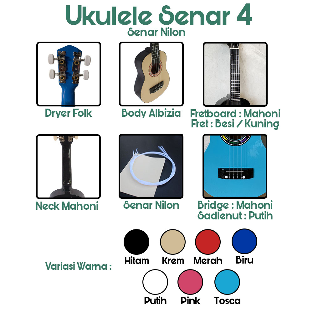 SELAMAT DATANG DI TOKO GITAR ONLINE PUSAT GITAR SOLO , PUSAT GITAR DAN AKSESORIS TERLENGKAP, MURAH DAN BERKUALITAS. - BANYAK HARGA YANG LEBIH MURAH TETAPI BELUM TERMASUK PACKING, DISINI SEMUA PAKET SUDAH TERMASUK PACKING KARDUS TEBAL JAMIN AMAN SAMPAI PULAU JAWA. APABILA TERJADI KERUSAKAN BISA DIRETUR KAMI GANTI BARU (GARANSI). - SPESIFIKASI : Body : Albizia Neck : Mahoni Dryer : Folk Fretboard : Mahoni Fret : Besi / Kuning Bridge : Mahoni Sadlenut : Putih Senar : Nilon - Sebelum Order, Harap Perhatikan Pilihan Paketnya : - PAKET A = 1 Unit Ukulele dengan Senar Terpasang + 1 Pick + Packing Kardus Tebal PAKET B = 1 Unit Ukulele dengan Senar Terpasang + 1 Tas + 1 Pick + Packing Kardus Tebal PAKET C = 1 Unit Ukulele dengan Senar Terpasang + 1 Tas + 1 Pick + 1 Senar + 1 Capo + Packing Kardus Tebal - GARANSI 100% RUSAK KAMI GANTI BARU. - Buat yang Cari alat musik murah meriah dan suara no fals. Cocok buat kamu yang suka bermain alat musik untuk sekedar menghabiskan waktu atau saat berkumpul dengan teman-teman. Pastinya akan semakin membangkitkan suasana nongkrong bareng temanmu. Kualitas mym music cek penilaian toko gan.