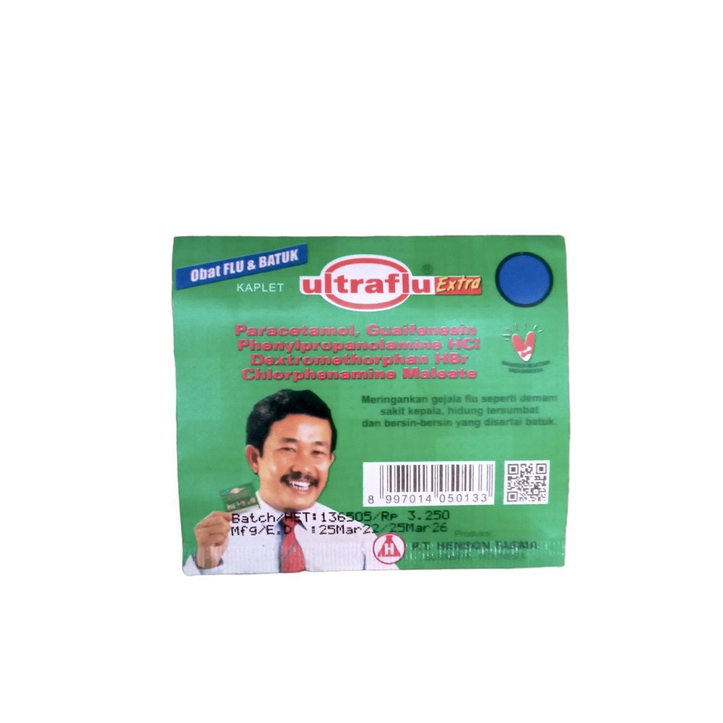 iseril guaikolat merupakan obat batuk ekspektoran yang merangsang pengeluaran dahak menuju faring. Fenilpropanolamin termasuk jenis dekongestan yang digunakan untuk mengobati sumbatan pada hidung yang berhubungan dengan alergi. dextromethorphan HBr untuk mengatasi batuk kering yang disertai flu. Sedangkan klorfeniramin maleat atau yang sering disebut CTM merupakan antihistamin yang memberikan efek samping mengantuk Kemasan 1 Dos isi 25 Strip Indikasi / Manfaat / Kegunaan : Meringankan gejala flu seperti demam, sakit kepala, hidung tersumbat, dan bersin-bersin yang disertai batuk. Sub Kategori Obat Batuk dan Pilek