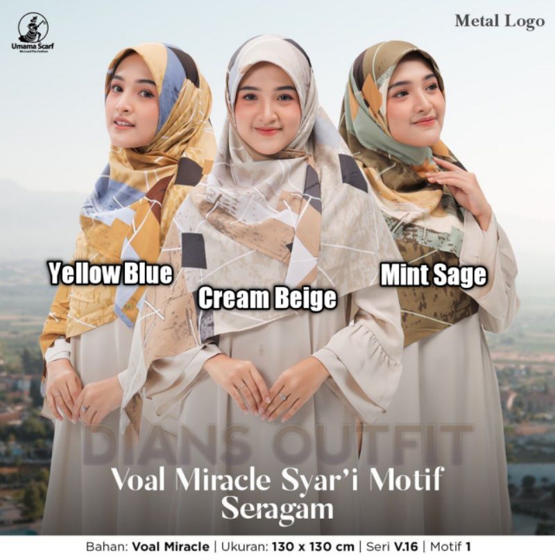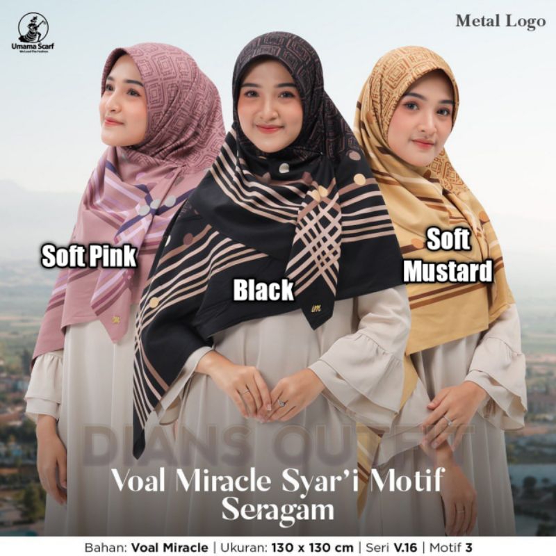 Miracle Syar'i Print Metal Logo terbaru by Umama Scarf. Bertekstur silky, tebal dan tidak menerawang. Dilengkapi dengan lasercut dan logo metal gold pada pinggiran hijabnya.