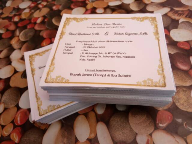 Minimal order 100 lembar Bahan kertas HVS 70 gsm Ukuran 15 x 17 cm Kertas undangan yg di tempelkan di nasi kotak / berkat. Harga per lembar Border warna gold, tulisan warna hitam Format order harap tuliskan : Nama pengantin, hari tgl jam tempat, dan nama orang tua