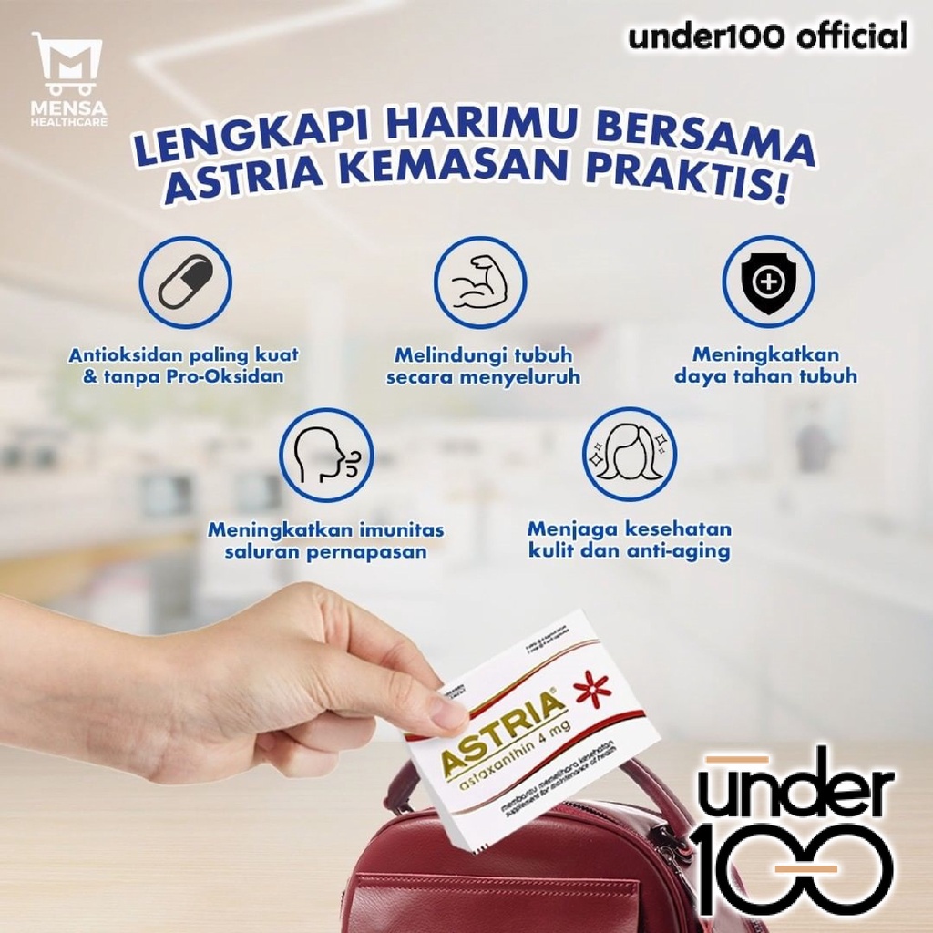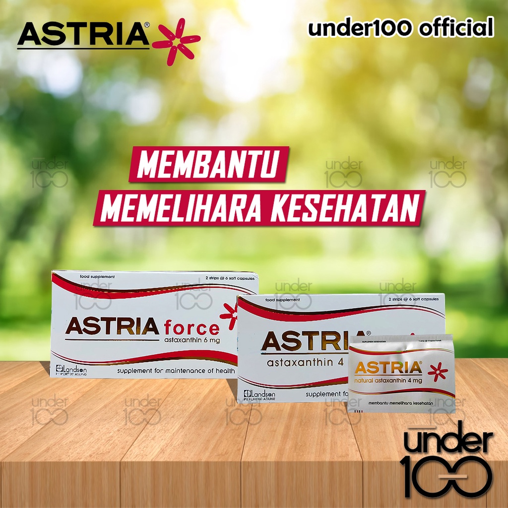 ❤ ASTRIA Astaxanthin 4 mg -Soft capsule ASTRIA berwarna merah berisi astaxanthin alami dalam bentuk oil yang berasal dari ganggang merah -Diformulasikan dengan bahan baku yang halal -Astaxanthin merupakan antioksidan kuat -Astria bermanfaat untuk melindungi tubuh dari dampak buruk radikal bebas sehingga baik untuk menjaga daya tahan tubuh dan memelihara kesehatan kulit